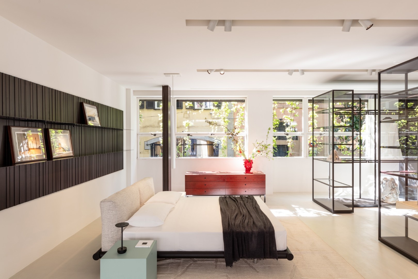 In the bedroom, a balance of contemporary style and nostalgia unfolds. The Byron bed by Piero Lissoni contrasts its upholstered frame and soft linen-covered headboard cushions with a screen featuring a black-stained solid ash frame enclosing an intricate woven cane panel.