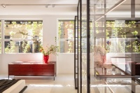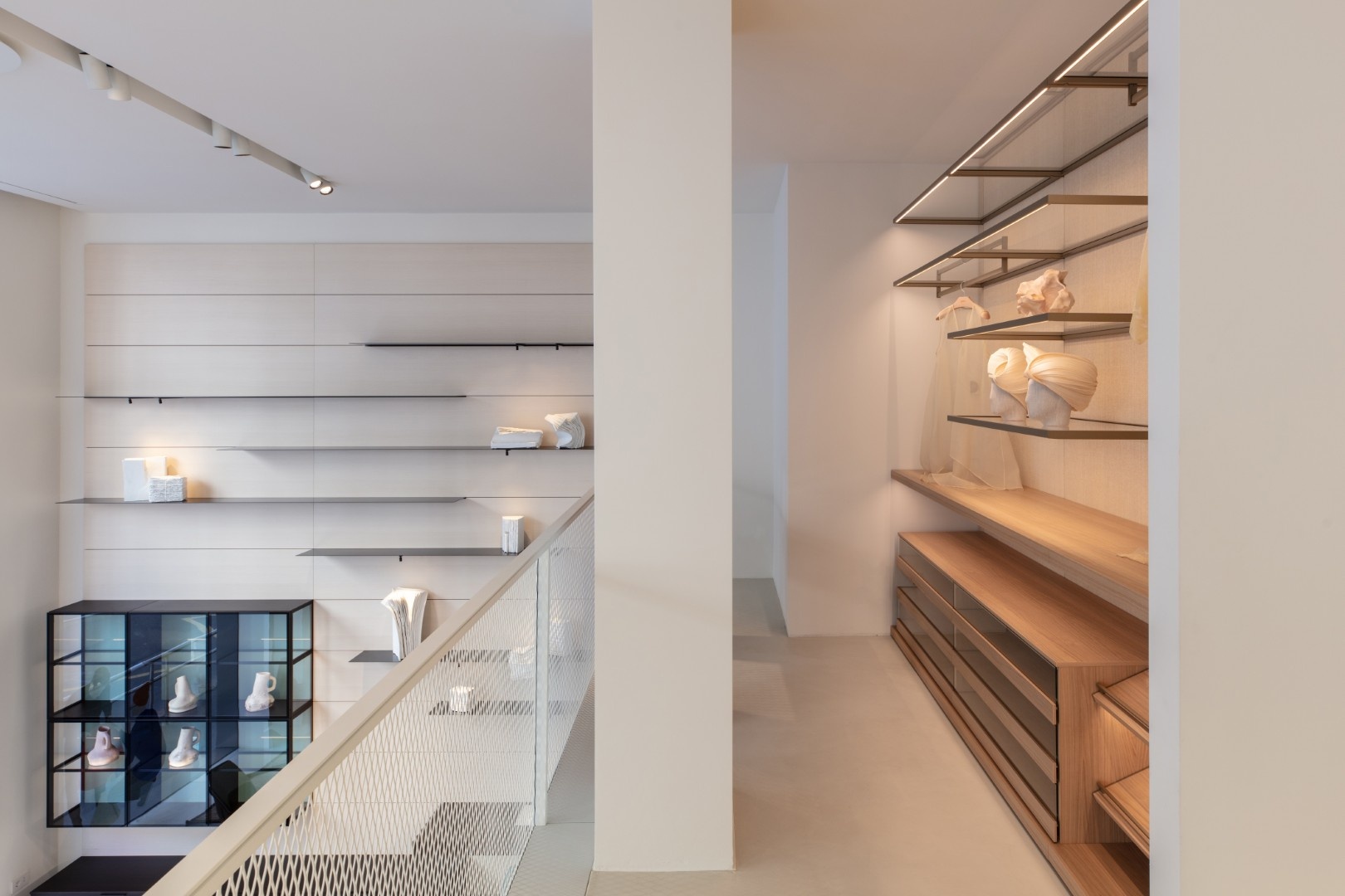 The journey begins in a striking double-height area, where visitors are welcomed by a showcase of tactile and visual refinement, Ex-Libris by Piero Lissoni features a dark black sugi melamine base and top that enhance the objects displayed within this striking glass case, enclosed by transparent glass Block doors.